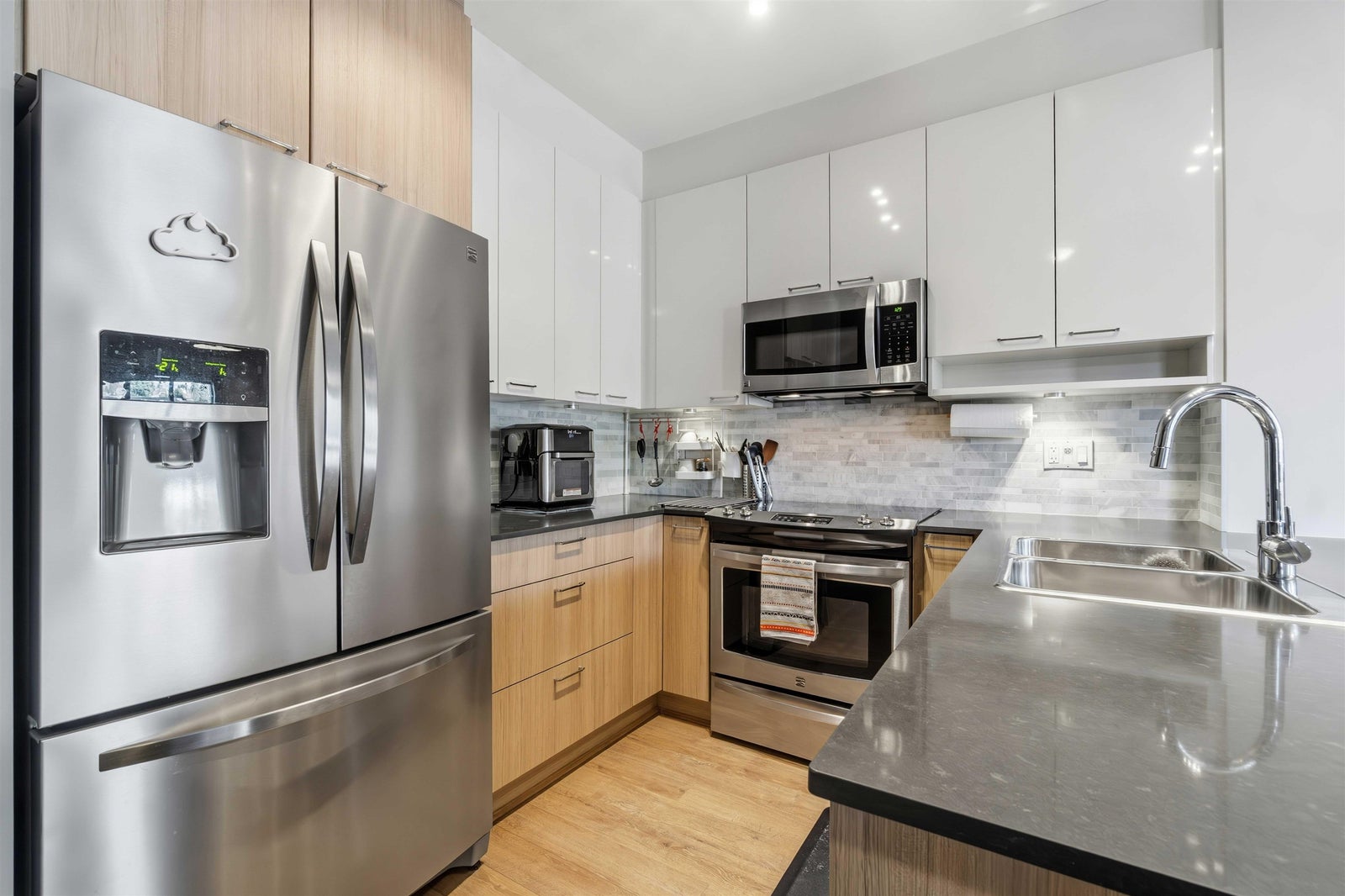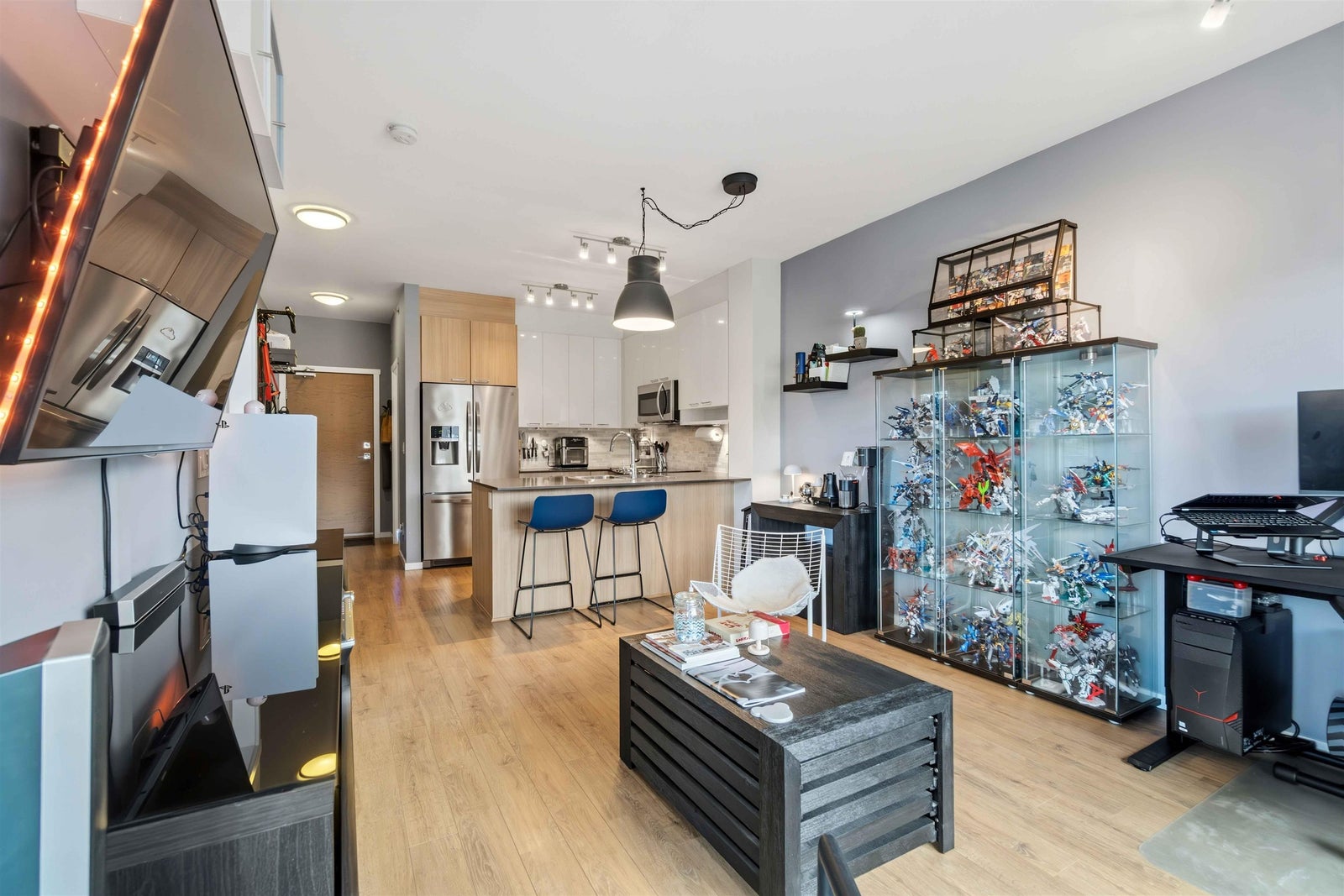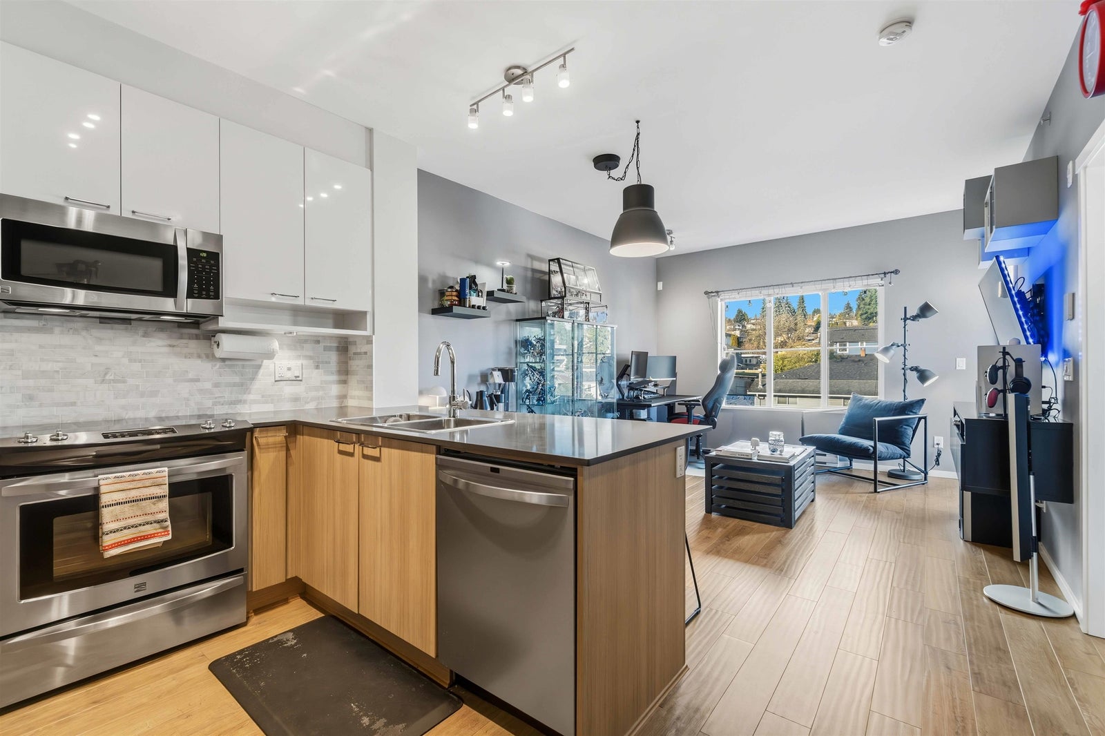 Welcome to MACKIN Park! This bright one-bedroom home offers 538 square feet of well-designed living with a clean, modern feel. The kitchen features stainless steel appliances, laminate flooring runs through the main living space, and the full-size washer and dryer add real convenience. The bedroom is comfortably sized, the bathroom is finished with contemporary details, and the home includes a secured parking stall and storage locker. Enjoy a strong lineup of building amenities, including a Fitness Centre, Bike Room, Car Wash Bay, and Resident Lounge. Located in Coquitlam’s Mackin Park neighbourhood, you’re steps from cafés, shops, parks, and transit, with quick access to Lougheed and nearby routes. BONUS INCENTIVE: Seller will pre-pay 6 MONTHS of strata fees!